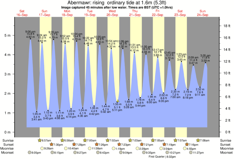Image captured 45 minutes after low water (rising ordinary tide). Tide height was 1.6m (5.3 ft). Range 5.18m (17.0 ft). Toggle tide graph