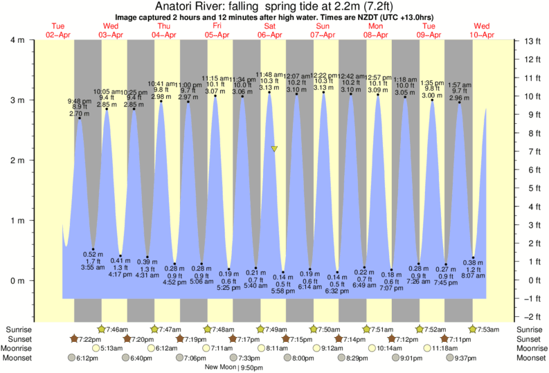 Image captured 2 hours and 12 minutes after high water (falling spring tide). Tide height was 2.2m (7.2 ft). Range 3.91m (12.8 ft). Toggle tide graph