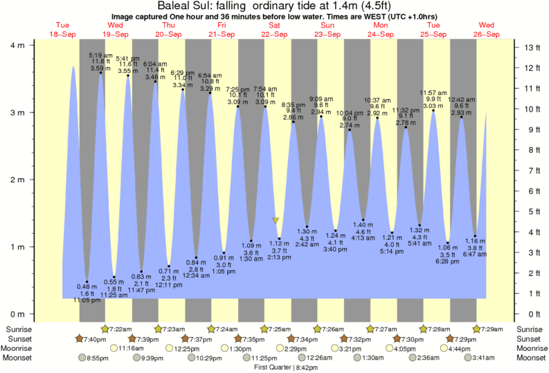 Image captured One hour and 36 minutes before low water (falling ordinary tide). Tide height was 1.4m (4.5 ft). Range 3.51m (11.5 ft). Toggle tide graph