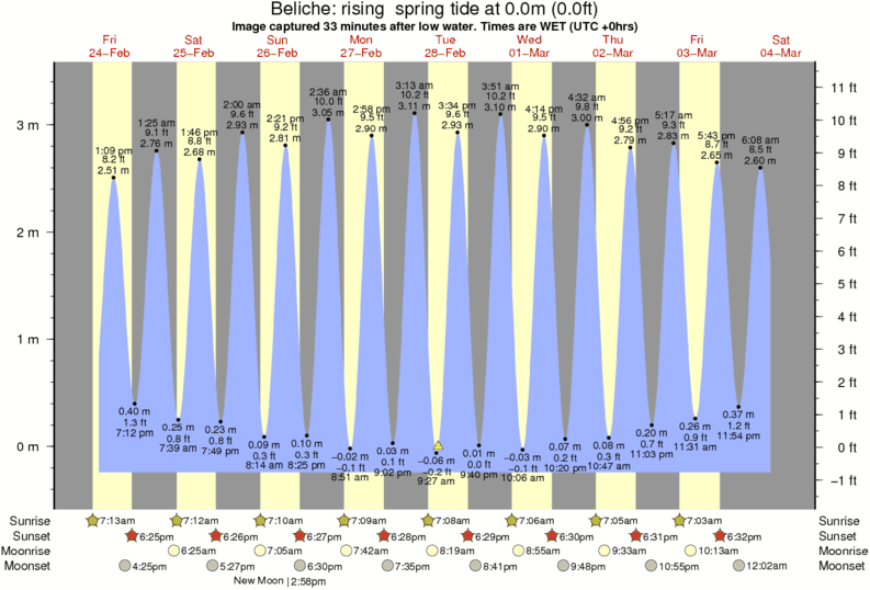 Image captured 33 minutes after low water (rising spring tide). Tide height was 0.0m (0.0 ft). Range 3.48m (11.4 ft). Toggle tide graph
