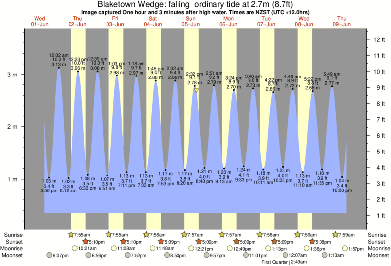 Image captured One hour and 3 minutes after high water (falling ordinary tide). Tide height was 2.7m (8.7 ft). Range 3.21m (10.5 ft). Toggle tide graph
