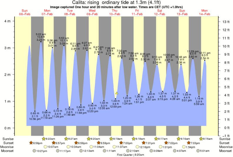 Image captured One hour and 20 minutes after low water (rising ordinary tide). Tide height was 1.3m (4.1 ft). Range 3.72m (12.2 ft). Toggle tide graph
