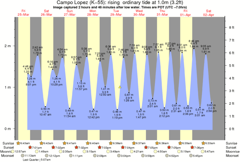 Image captured 2 hours and 46 minutes after low water (rising ordinary tide). Tide height was 1.0m (3.2 ft). Range 2.48m (8.1 ft). Toggle tide graph