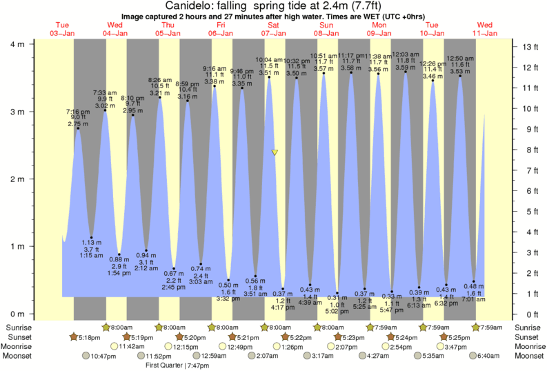 Image captured 2 hours and 27 minutes after high water (falling spring tide). Tide height was 2.4m (7.7 ft). Range 3.48m (11.4 ft). Toggle tide graph