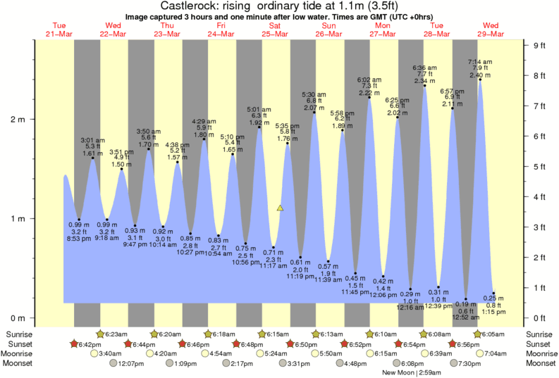 Image captured 3 hours and one minute after low water (rising ordinary tide). Tide height was 1.1m (3.5 ft). Range 2.41m (7.9 ft). Toggle tide graph