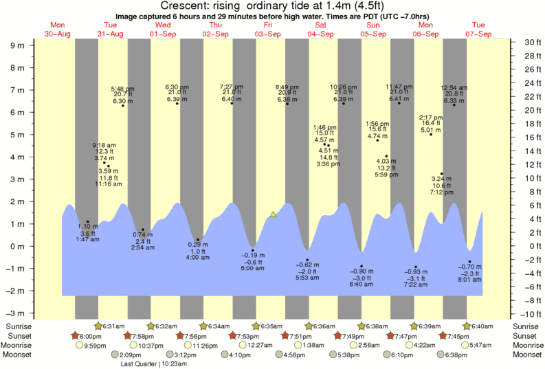 Image captured 6 hours and 29 minutes before high water (rising ordinary tide). Tide height was 1.4m (4.5 ft). Range 10.48m (34.4 ft). Toggle tide graph