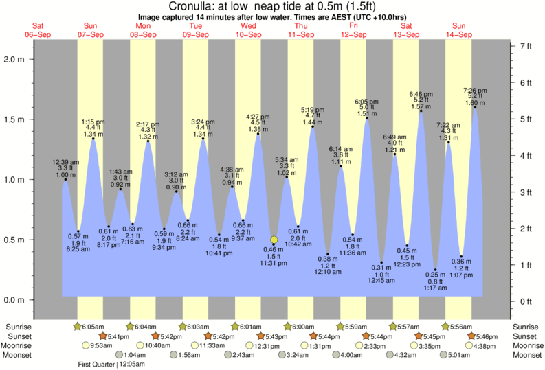 Image captured 14 minutes after low water (at low neap tide). Tide height was 0.5m (1.5 ft). Range 1.94m (6.4 ft). Toggle tide graph