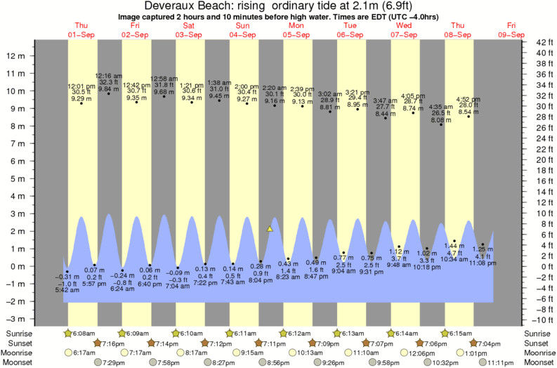 Image captured 2 hours and 10 minutes before high water (rising ordinary tide). Tide height was 2.1m (6.9 ft). Range 13.62m (44.7 ft). Toggle tide graph