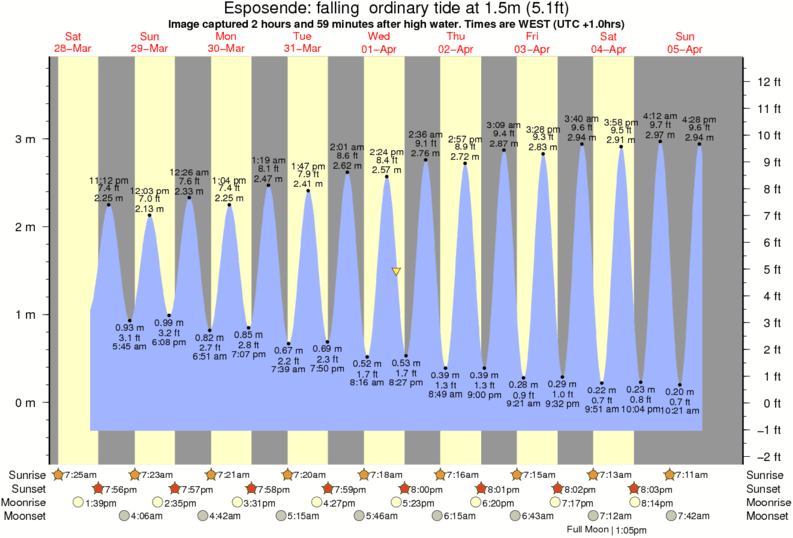 Image captured 2 hours and 59 minutes after high water (falling ordinary tide). Tide height was 1.5m (5.1 ft). Range 3.87m (12.7 ft). Toggle tide graph