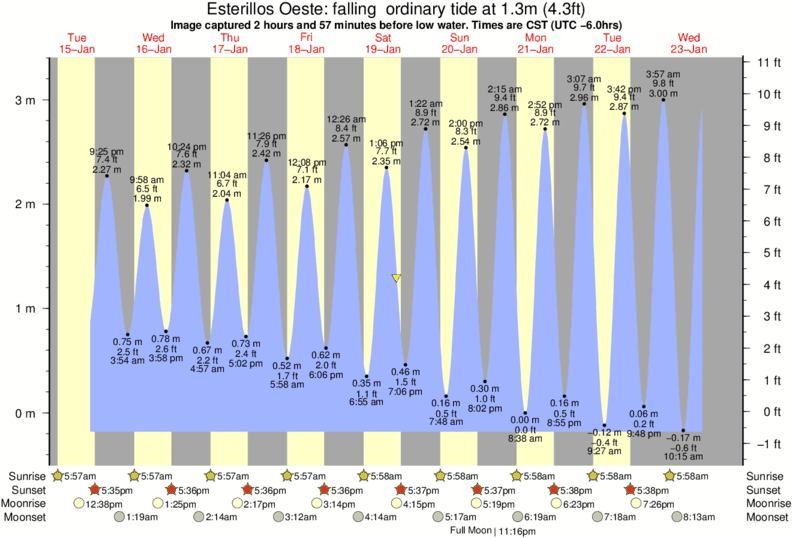 Image captured 2 hours and 57 minutes before low water (falling ordinary tide). Tide height was 1.3m (4.3 ft). Range 3.26m (10.7 ft). Toggle tide graph
