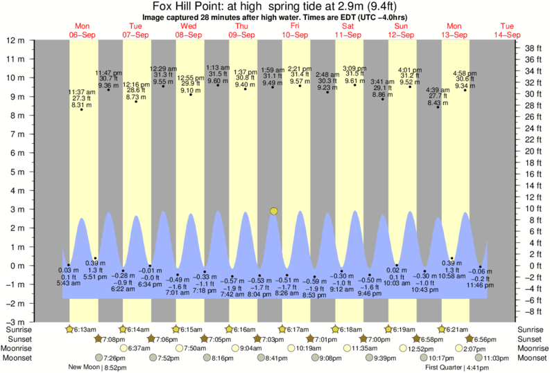 Image captured 28 minutes after high water (at high spring tide). Tide height was 2.9m (9.4 ft). Range 12.53m (41.1 ft). Toggle tide graph