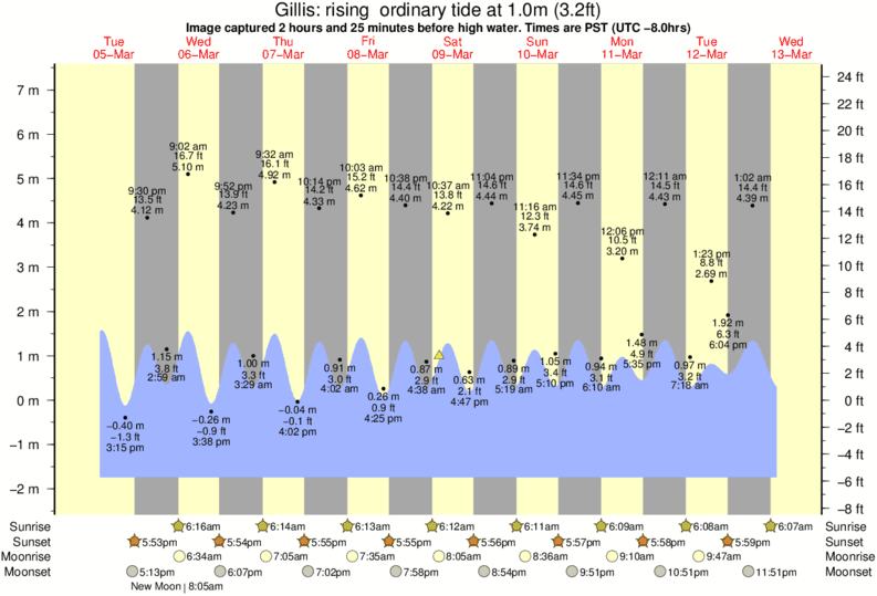 Image captured 2 hours and 25 minutes before high water (rising ordinary tide). Tide height was 1.0m (3.2 ft). Range 8.49m (27.9 ft). Toggle tide graph