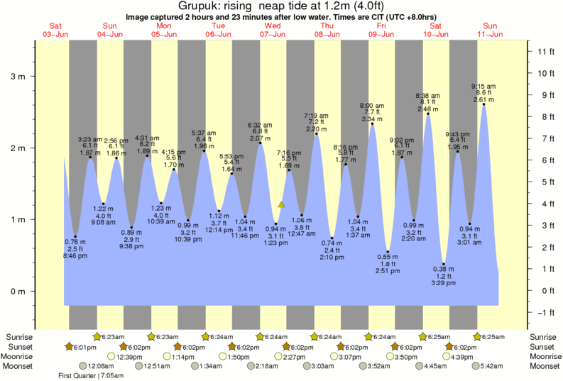 Image captured 2 hours and 23 minutes after low water (rising neap tide). Tide height was 1.2m (4.0 ft). Range 3.37m (11.1 ft). Toggle tide graph