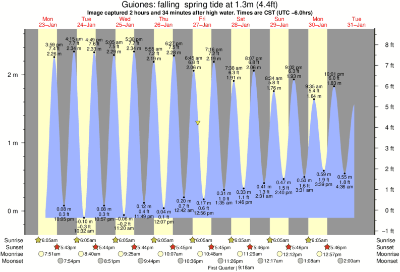 Image captured 2 hours and 34 minutes after high water (falling spring tide). Tide height was 1.3m (4.4 ft). Range 2.52m (8.3 ft). Toggle tide graph