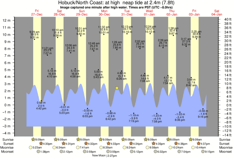 Image captured one minute after high water (at high neap tide). Tide height was 2.4m (7.8 ft). Range 14.16m (46.5 ft). Toggle tide graph