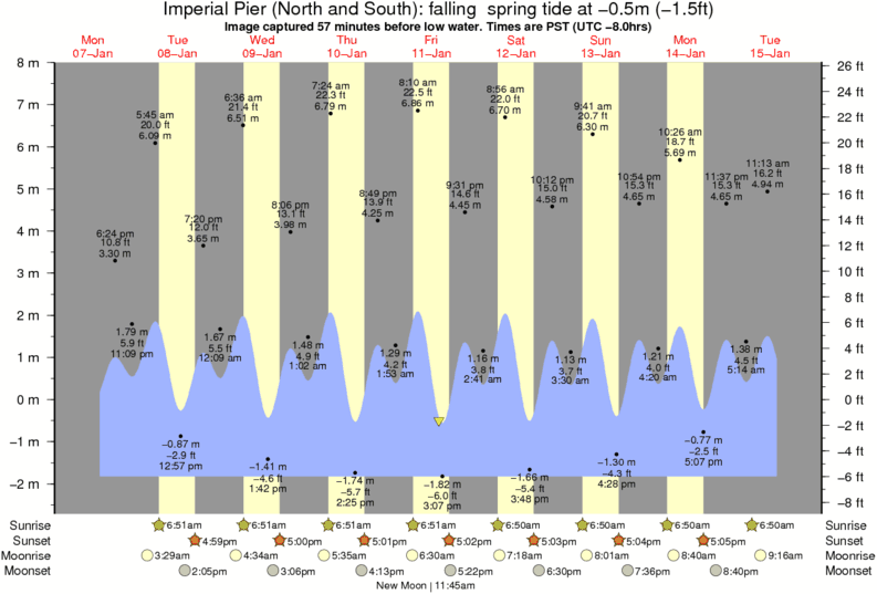 Image captured 57 minutes before low water (falling spring tide). Tide height was -0.5m (-1.5 ft). Range 8.93m (29.3 ft). Toggle tide graph