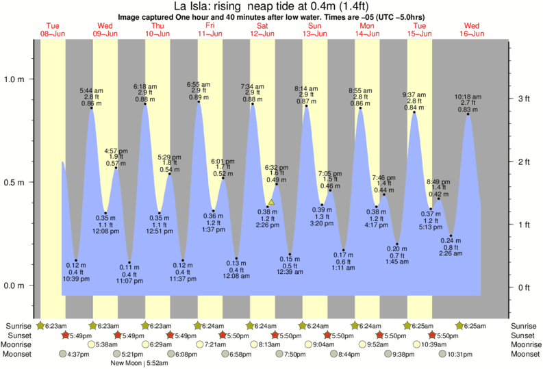 Image captured One hour and 40 minutes after low water (rising neap tide). Tide height was 0.4m (1.4 ft). Range 1.13m (3.7 ft). Toggle tide graph