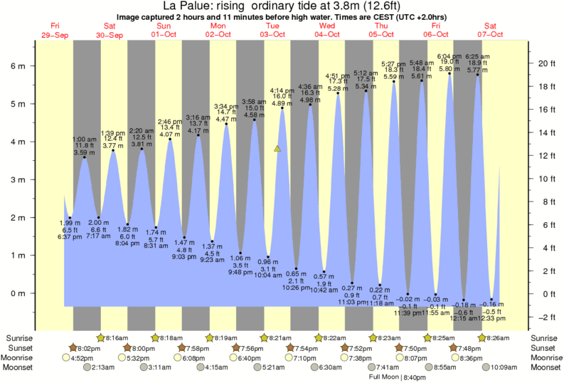 Image captured 2 hours and 11 minutes before high water (rising ordinary tide). Tide height was 3.8m (12.6 ft). Range 6.39m (21.0 ft). Toggle tide graph