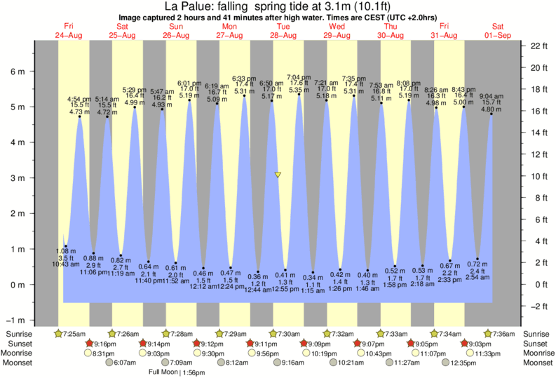 Image captured 2 hours and 41 minutes after high water (falling spring tide). Tide height was 3.1m (10.1 ft). Range 6.71m (22.0 ft). Toggle tide graph