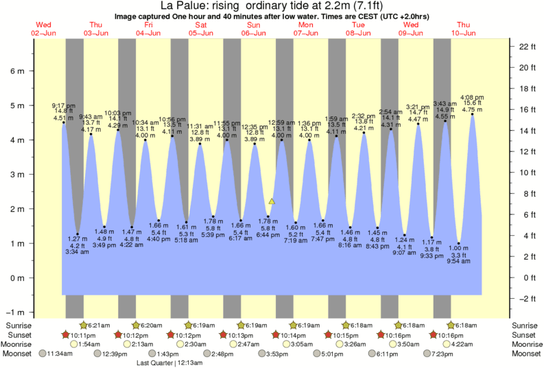 Image captured One hour and 40 minutes after low water (rising ordinary tide). Tide height was 2.2m (7.1 ft). Range 6.76m (22.2 ft). Toggle tide graph