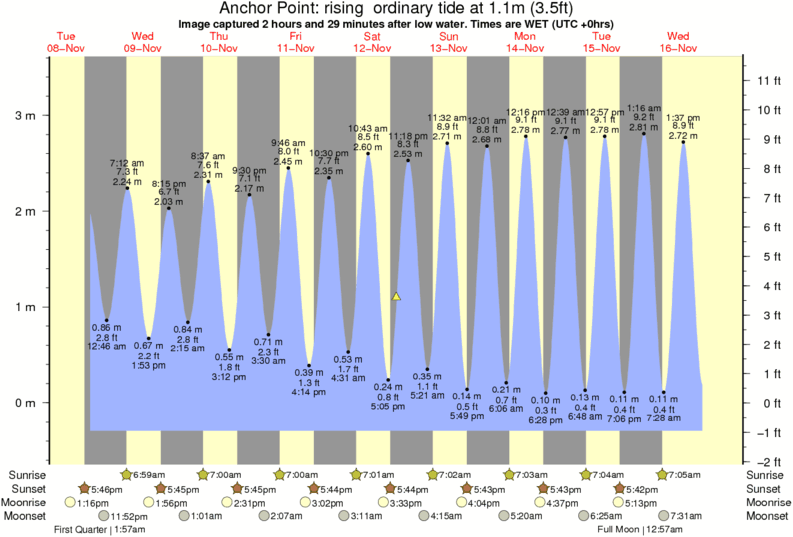 Image captured 2 hours and 29 minutes after low water (rising ordinary tide). Tide height was 1.1m (3.5 ft). Range 3.55m (11.6 ft). Toggle tide graph
