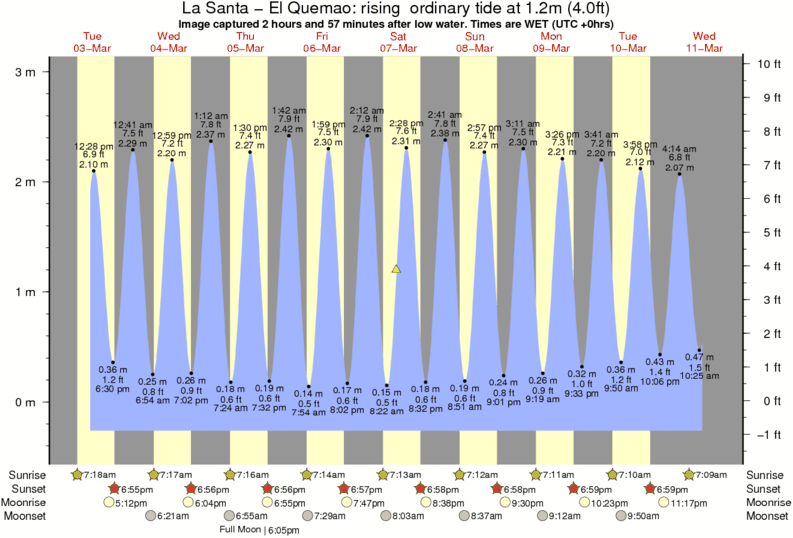 Image captured 2 hours and 57 minutes after low water (rising ordinary tide). Tide height was 1.2m (4.0 ft). Range 3.09m (10.1 ft). Toggle tide graph
