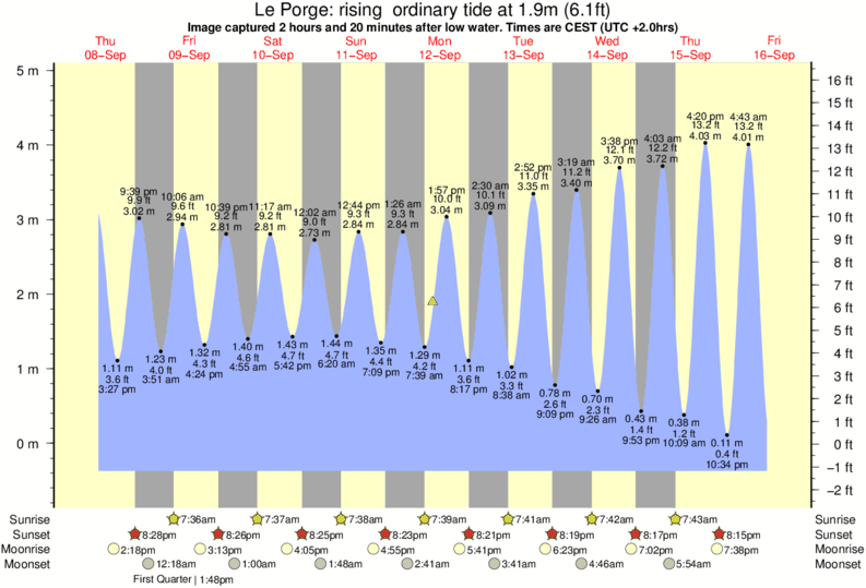 Image captured 2 hours and 20 minutes after low water (rising ordinary tide). Tide height was 1.9m (6.1 ft). Range 4.98m (16.3 ft). Toggle tide graph