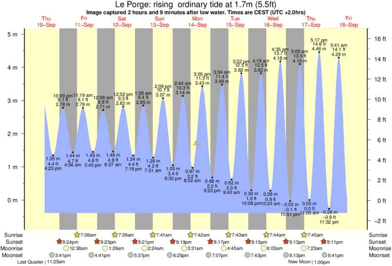Image captured 2 hours and 9 minutes after low water (rising ordinary tide). Tide height was 1.7m (5.5 ft). Range 5.06m (16.6 ft). Toggle tide graph