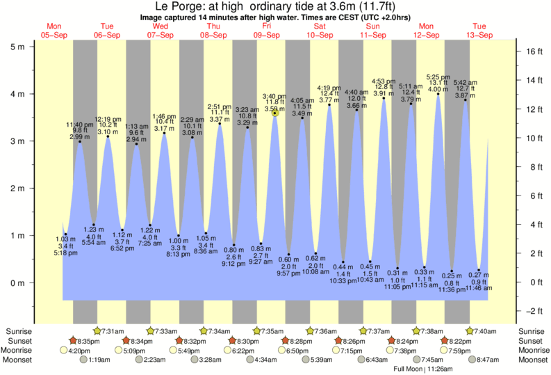 Image captured 14 minutes after high water (at high ordinary tide). Tide height was 3.6m (11.7 ft). Range 5.01m (16.4 ft). Toggle tide graph