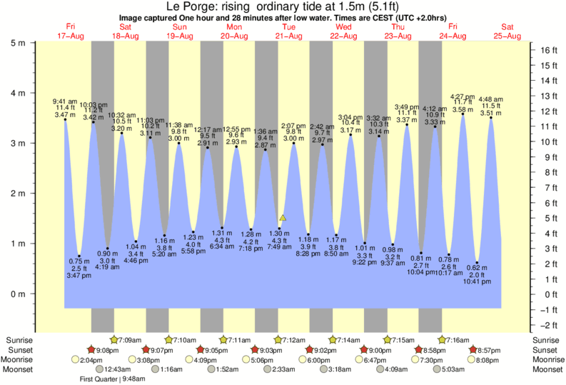 Image captured One hour and 28 minutes after low water (rising ordinary tide). Tide height was 1.5m (5.1 ft). Range 4.84m (15.9 ft). Toggle tide graph