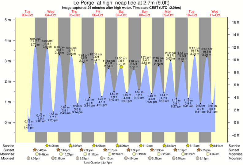 Image captured 24 minutes after high water (at high neap tide). Tide height was 2.7m (9.0 ft). Range 5.07m (16.6 ft). Toggle tide graph