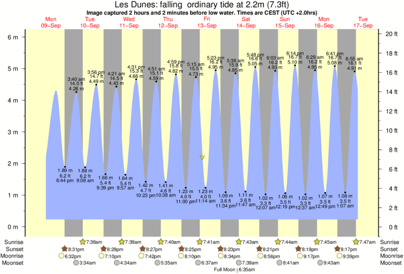 Image captured 2 hours and 2 minutes before low water (falling ordinary tide). Tide height was 2.2m (7.3 ft). Range 5.47m (17.9 ft). Toggle tide graph