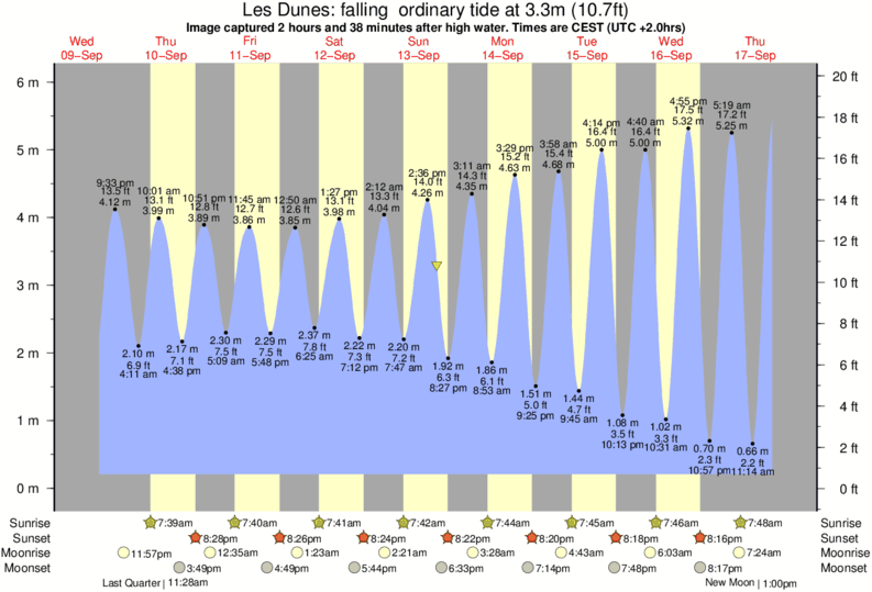 Image captured 2 hours and 38 minutes after high water (falling ordinary tide). Tide height was 3.3m (10.7 ft). Range 5.52m (18.1 ft). Toggle tide graph