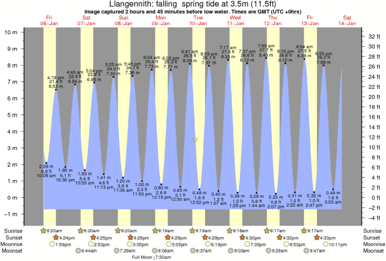Image captured 2 hours and 45 minutes before low water (falling spring tide). Tide height was 3.5m (11.5 ft). Range 10.00m (32.8 ft). Toggle tide graph