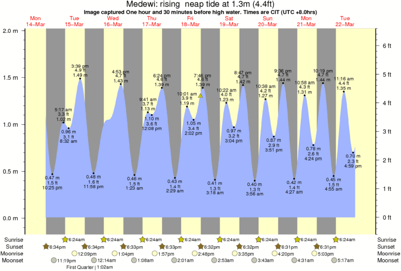 Image captured One hour and 30 minutes before high water (rising neap tide). Tide height was 1.3m (4.4 ft). Range 1.83m (6.0 ft). Toggle tide graph