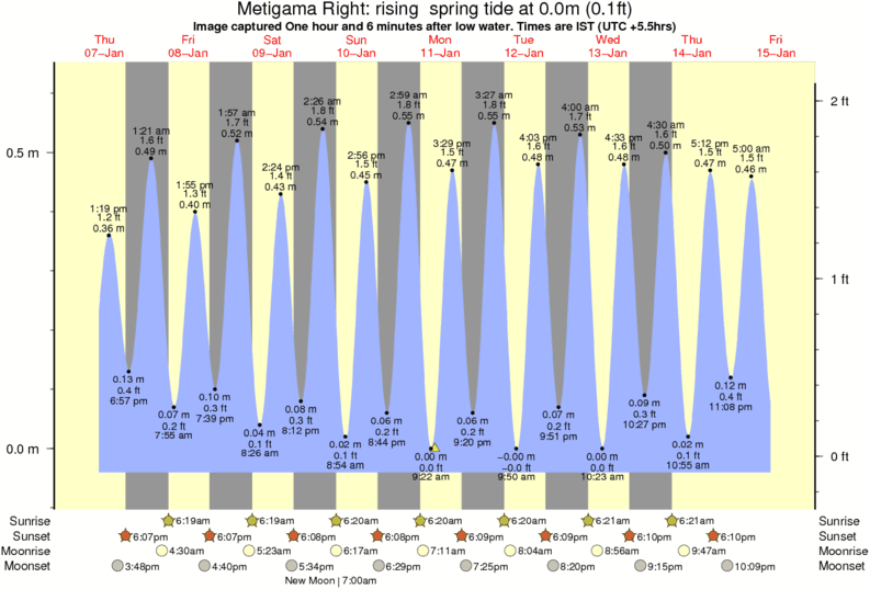 Image captured One hour and 6 minutes after low water (rising spring tide). Tide height was 0.0m (0.1 ft). Range 0.63m (2.1 ft). Toggle tide graph