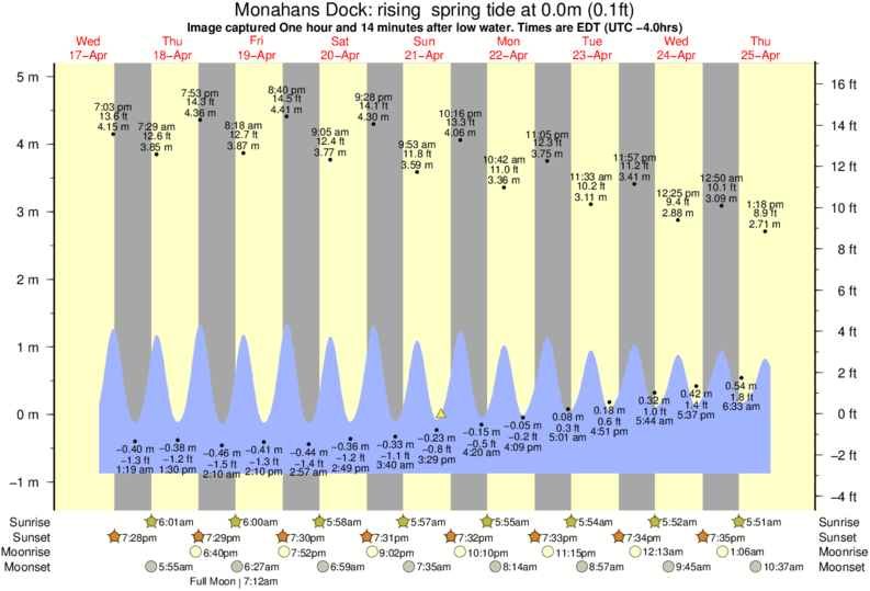 Image captured One hour and 14 minutes after low water (rising spring tide). Tide height was 0.0m (0.1 ft). Range 5.52m (18.1 ft). Toggle tide graph