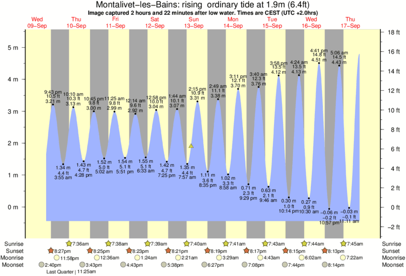 Image captured 2 hours and 22 minutes after low water (rising ordinary tide). Tide height was 1.9m (6.4 ft). Range 5.46m (17.9 ft). Toggle tide graph
