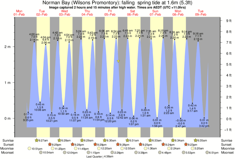 Image captured 2 hours and 15 minutes after high water (falling spring tide). Tide height was 1.6m (5.3 ft). Range 2.80m (9.2 ft). Toggle tide graph