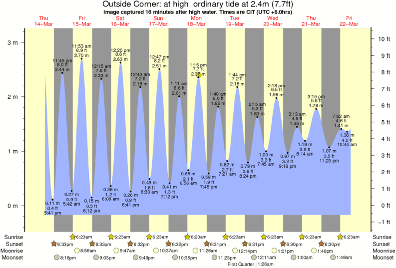 Image captured 16 minutes after high water (at high ordinary tide). Tide height was 2.4m (7.7 ft). Range 3.12m (10.2 ft). Toggle tide graph