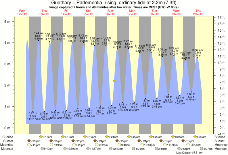 Image captured 2 hours and 40 minutes after low water (rising ordinary tide). Tide height was 2.2m (7.3 ft). Range 4.60m (15.1 ft). Toggle tide graph