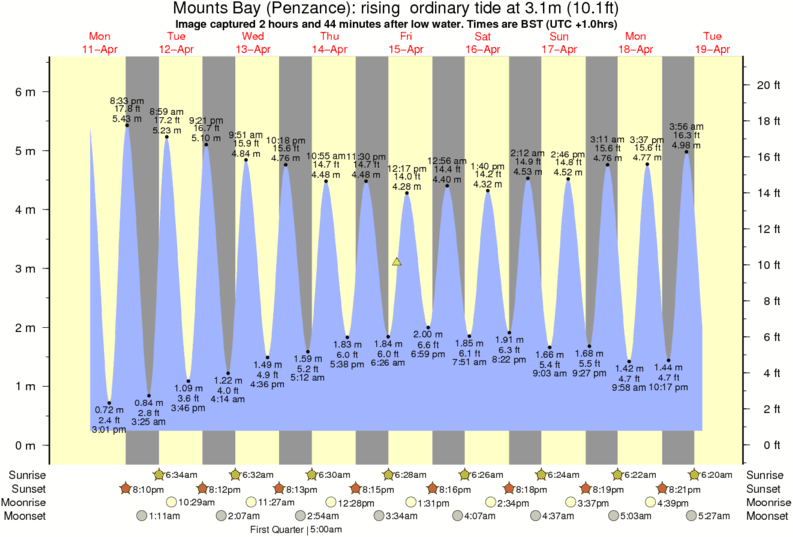 Image captured 2 hours and 44 minutes after low water (rising ordinary tide). Tide height was 3.1m (10.1 ft). Range 5.77m (18.9 ft). Toggle tide graph