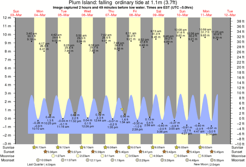 Image captured 2 hours and 49 minutes before low water (falling ordinary tide). Tide height was 1.1m (3.7 ft). Range 12.58m (41.3 ft). Toggle tide graph