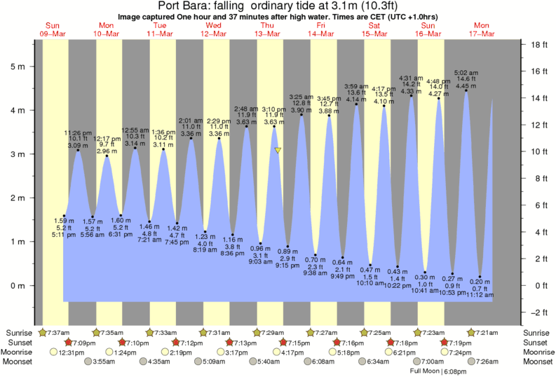 Image captured One hour and 37 minutes after high water (falling ordinary tide). Tide height was 3.1m (10.3 ft). Range 5.44m (17.8 ft). Toggle tide graph
