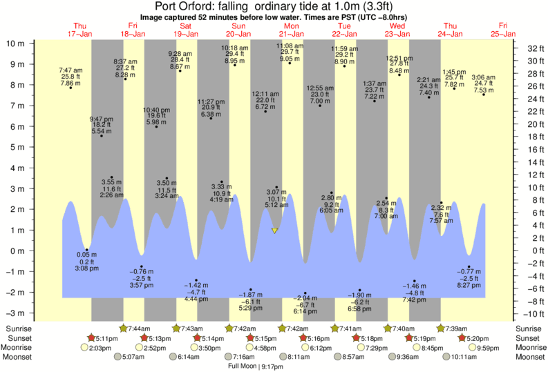 Image captured 52 minutes before low water (falling ordinary tide). Tide height was 1.0m (3.3 ft). Range 11.32m (37.1 ft). Toggle tide graph