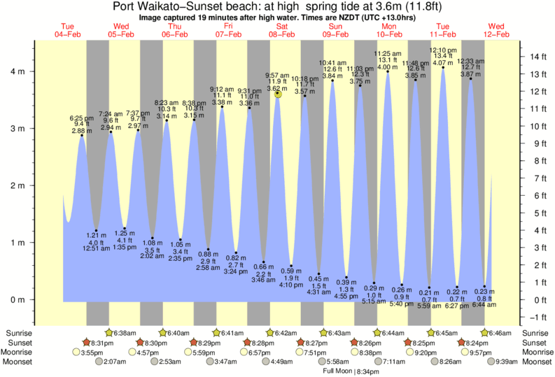Forecast wind and swell just offshore from Port Waikato-Sunset beach around the time the photo was taken