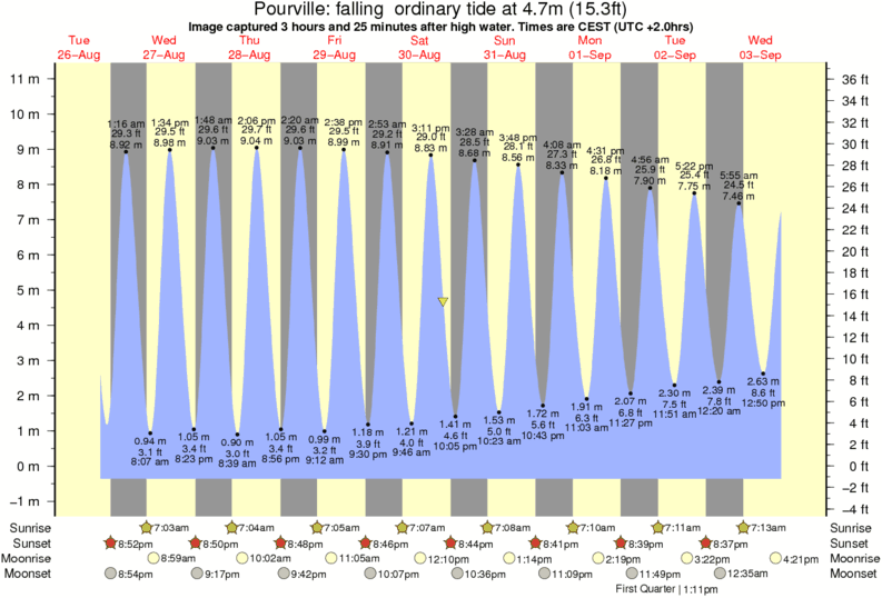 Image captured 3 hours and 25 minutes after high water (falling ordinary tide). Tide height was 4.7m (15.3 ft). Range 10.73m (35.2 ft). Toggle tide graph