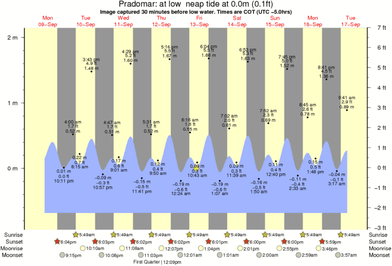 Image captured 30 minutes before low water (at low neap tide). Tide height was 0.0m (0.1 ft). Range 2.57m (8.4 ft). Toggle tide graph