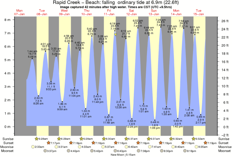 Image captured 42 minutes after high water (falling ordinary tide). Tide height was 6.9m (22.6 ft). Range 7.44m (24.4 ft). Toggle tide graph