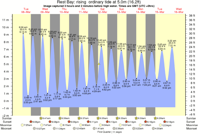 Image captured 3 hours and 2 minutes before high water (rising ordinary tide). Tide height was 5.0m (16.2 ft). Range 11.50m (37.7 ft). Toggle tide graph
